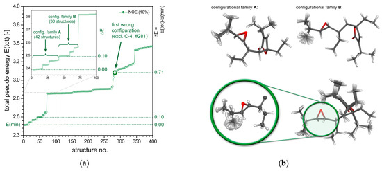 In the low-pseudo energy region of structures identified for 2 (“best 100” inset plot of Figure 5a) six small energy steps are present, which in total correspond to two configurational families A (#1 to #42, in total 42 structures) and B (#43 to #72, in total 30 structures) separated by a very small energy difference with . Both families are subclassified by even smaller energy jumps due to different rotamers of the ethyl groups, which arise from the impossibility to assign the diastereotopic methylene protons a priori and individually in this example. All structures of groups A and B feature the same relative configuration of the stereogenic centers C-6, C-7, and C-8, but differ in their configuration of C-4 only (see structures shown in Figure 5b). Noteworthy, as a side note, is the fact that the structures in group B actually emerged as mirror images, because we fixed the configuration of C-4 in the calculations presented here, and were inverted for plotting in Figure 5b for clarity only. In Figure 5a, additional ethyl rotamers and C-10 epimers intermixed with each other are found along the first larger step of pseudo energy ranked structures (#73 to #280), followed by another step that is associated with the first wrong side chain configuration (structure No. #281, bold green circle in Figure 5a).