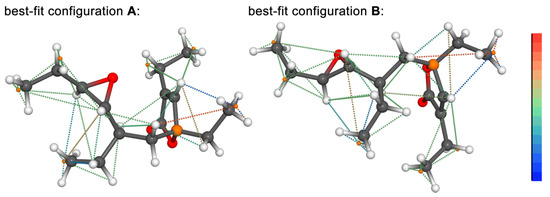 Plot of the best-fit (minimum pseudo energy) DG structures of both configurations ((A,B), C-4 epimers, atom C-4 is presented in orange) of plakilactone H (2) with color-coded representation of all NOE contacts used in the configurational and conformational analysis. The color scale was adapted from calculated final NOE violations, ranging from −0.25 Å (blue) to +0.25 Å (red).