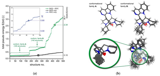 For demonstration purposes, we have, therefore, decided to add artificial residual dipolar couplings (RDCs) to the dataset of 3. The RDCs were calculated from the crystal structure of 3 [41] in conjunction with a randomly generated alignment tensor [36] in order to obtain a total of 28 RDCs (the complete list of RDCs of 3 is given in the Supplementary Materials, Table S4; the dataset included all methine and methylene protons, where the latter were used only as the corresponding sums of two C-H dipolar couplings without individual diastereotopic assignments). The green line in Figure 7a displays the result for the combined NOE and RDC dataset. Here, the first wrong configuration of 3 is structure No. 422 (green circle in Figure 7a), which differs from structures #1 to #421 by the relative configuration of C-12. By analyzing the structures with correct relative configuration, two conformational families A (185 structures) and B (142 structures) of 3 can easily be identified (Figure 7a). The plot in Figure 7b (top, left) shows the superimposed structures #1 to #185 (conformational family A) of manzamine A (3) and also the structures #186 to #327 (top, right; conformational family B). All structures with the correct configuration of 3 (420 structures) are shown in Figure 7b (bottom).