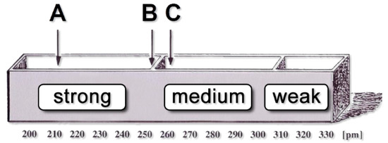 Schematic representation of the division of NOEs/ROEs intensities into “rough” ranges (“weak”, “medium”, and “strong”; adapted from a graphic by Horst Kessler). Although the distances B and C are almost identical, they are assigned to two different regions.