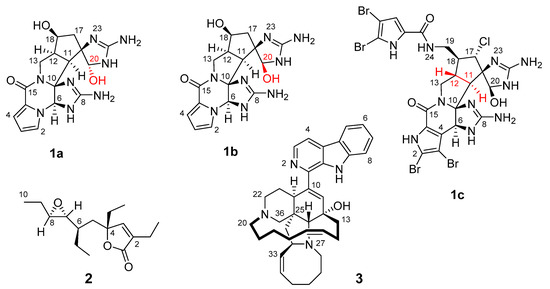 Structural formulae of the investigated molecules with atom numbering, respectively: synthetic cis-palau’amine derivatives 1a and 1b, tetrabromostyloguanidine (1c), plakilactone H (2), and manzamine A (3). Important positions with respect to the configuration of 1 are highlighted in red.