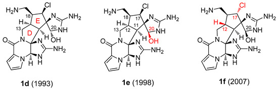Original (1993: 1d [39]) and revised (1998: 1e [43] and 2007: 1f [45]) structural formulae of palau’amine. The structures are all shown in the correct absolute configuration [50,52,53] and therefore, 1d and 1e are drawn as enantiomers, compared to the original publications [39,43].