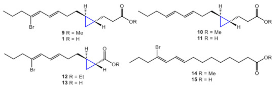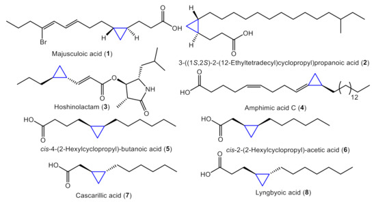 Cyclopropane fatty acids (CFAs, Figure 1) are commonly found in terrestrial plants and marine organisms including sponges and bacteria [9,10,11,12]. Since a cyclopropane motif can provide specific steric, stereo-electronic, and electronic properties [9], many CFAs showed intriguing bioactivities, such as anticancer [13], antimicrobial [11,12], antitrypanosomal [14], β-arrestin-biased agonistand [12], and topoisomerase I inhibitory activity [15].