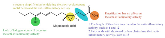 The anti-inflammatory activity of majusculoic acid and its analogs was determined in the LPS-induced RAW264.7 macrophages. (−)-Majusculoic acid (1), methyl majusculoate (9) and ethyl-(1R,2R)-2-((3E,5Z)-6-bromonona-3,5-dien-1-yl)cyclopropane-1-carboxylate (12) showed weak inhibitory activity. Noteworthy, all three compounds showed dose-dependent effects (Table 1).