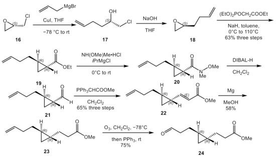 As shown in Scheme 1, the aldehyde 24 was obtained through eight steps. The chiral epoxide 16, after the nucleophilic addition reaction with the allyl magnesium bromide, provided the chlorinated secondary alcohol 17, which was transformed into the new epoxide 18 by the treatment with NaOH [17]. By conformationally controlled establishment of the trans-4,6-dialkylcyclopropane through Horner reagent in the presence of NaH [18], the ester 19 was treated with isopropylmagnesium chloride and N,O-dimethylhydroxylamine hydrochloride to afford the Weinreb amide 20. After reduction by diisobutylaluminium hydride (DIBAL-H), the amide 20 was transformed to aldehyde. Wittig reagent was used to extend the length of the chain from aldehyde 21 to alkene ester 22. Before the ozonolytic cleavage of the double bond, the alkene ester 22 was selectively reduced by magnesium in MeOH. After the aldehyde 24 was synthesized, HWE reaction was applied to establish the conjugated diene motif. It is concise to construct the trans-cyclopropane unit and extend the chain.