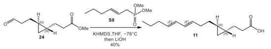 4.3.2. Synthesis of Methyl 3-((1R,2R)-2-((3E,5E)-nona-3,5-dien-1-yl) cyclopropyl) Propanoic Acid (11)