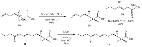 4.3.5. Synthesis of (1R,2R)-2-((3E,5Z)-6-bromonona-3,5-dien-1-yl) cyclopropane-1-carboxylic Acid (13)