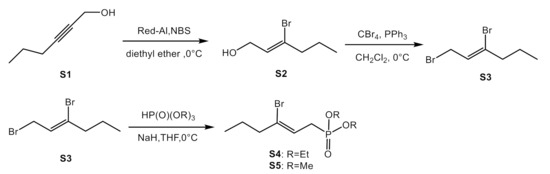 The bromo-olefination of aldehyde was realized based on the reported strategy [16]. Similarly, the synthesis of (Z)-1,3-dibromohex-2-ene and (S3), diethyl (Z)-(3-bromohex-2-en-1-yl)phosphonate (S4) and dimethyl (Z)-(3-bromohex-2-en-1-yl)phosphonate (S5) were conducted according to the referenced approach [16].