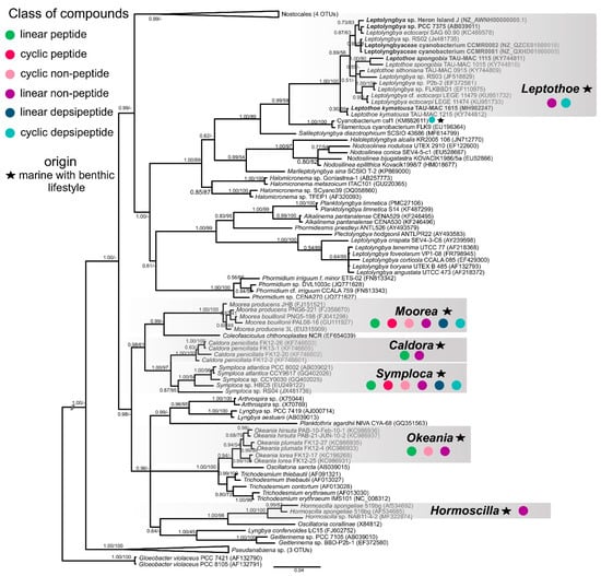 - Engene, N.; Tronholm, A.; Salvador-Reyes, L.A.; Luesch, H.; Paul, V.J. Caldora penicillata gen. nov., comb. nov. (Cyanobacteria), a pantropical marine species with biomedical relevance. J. Phycol. 2015, 51, 670–681. [Google Scholar] [CrossRef]