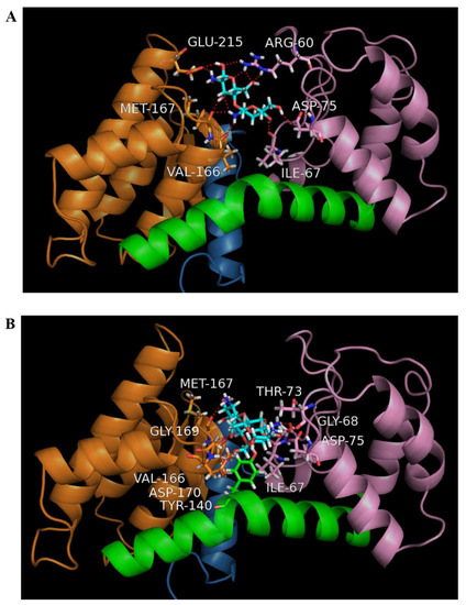 In order to insight into the possible interaction mode of Sn1-CSN with chitosan, its binding interactions with chitobiose and chitotriose were done by molecular docking. The TotalScores of binding of Sn1-CSN with chitobiose and chitotriose were 6.08 and 7.12, respectively, indicating that the binding interaction of Sn1-CSN with chitobiose is weaker than that with chitotriose. Structural analyses showed that chitobiose binds with Sn1-CSN by electrostatic interaction with Glu215 and hydrogen bonding with Arg60, Ile67, Asp75, Val166, and Met167, whereas chitotriose interacts with Sn1-CSN by electrostatic interaction with Asp75 and hydrogen bonding with Ile67, Gly68, Thr73, Asp75, Tyr140, Val166, Met167, Gly169, and Asp170 (Figure 3). Therefore, more hydrogen bonds are involved in the interaction of Sn1-CSN with chitotriose, leading to stronger binding interaction between Sn1-CSN and chitotriose than that between Sn1-CSN and chitobiose. Some involved residues are highly conserved among GH 46 chitosanases [9,26].