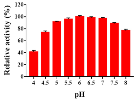 The effects of pH on Sn1-CSN activity. The percentages of activities at different pH values against the one at optimal pH (6.0) and 37 °C were calculated. The mean values ± standard deviations of three replicates were shown.