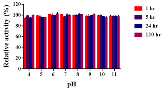 The pH stability of Sn1-CSN was investigated after being preincubated for a fixed time over the pH range of 4.0–11.0 (Figure 5). Sn1-CSN was stable over the pH range of 4.0–11.0, retaining > 90.0% original activity after 120 h. Therefore, Sn1-CSN was very stable between pH 4.0 and pH 11.0 and exhibited superior pH stability over a wide pH range.