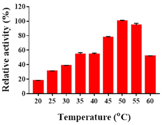 The optimal temperature of Sn1-CSN was determined (Figure 6). It showed the highest activity at 50 °C and kept >70% of residual activity between 45 °C and 55 °C and retained less than 55% of residual activity at 60 °C and below 40 °C.