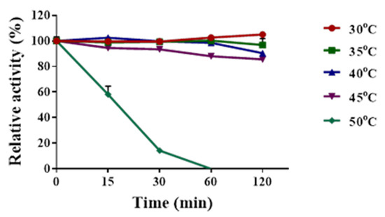 The thermal stability of Sn1-CSN was investigated after being preincubated for a fixed period at pH 6.0, and 30 °C, 35 °C, 40 °C, 45 °C, and 50 °C, respectively (Figure 7). Sn1-CSN was very stable below 35 °C and lost 9.6–14.4% of original activity after incubated at 40 °C and 45 °C for 2 h. It was completely inactivated at 50 °C after 1 h. Therefore, Sn1-CSN was a thermolabile chitosanase and was fairly stable below 45 °C.