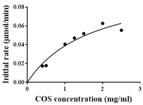 COS is the degradation product of chitosan and is the only natural oligosaccharide with a positive charge. COS can be prepared by chemical, physical, and enzymatic degradation [6]. Chemical methods mainly include oxidative and acidic degradation. However, these methods have the disadvantages such as violent reaction conditions, unwanted byproducts, poor selectivity, high monosaccharide content, uncontrollability, poor reproducibility, and serious environmental pollution [7]. Physical methods mainly involve photodegradation, ultrasonic and microwave degradation. Compared with chemical degradation, physical methods can be operated under mild conditions, with good controllability and simple operation, but they are difficult to obtain biologically active oligomers. Enzymatic approaches refer to enzymatic degradation of chitosan, which is advantageous over the other two approaches in mild reaction conditions, high yields, good selectivity, controllability and reproducibility, and beneficial to the environment. They have been widely used for COS production [6].
