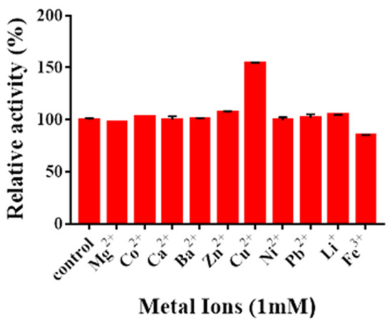 The effects of metal ions on Sn1-CSN activity were examined, too (Figure 9). Cu2+ upregulated the activity of Sn1-CSN by 54.2%, while Fe3+ decreased the activity of Sn1-CSN by 15.1%. Other metal ions did not show obvious influence on the catalytic activity of Sn1-CSN.