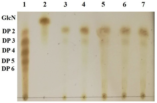 Thin-layer chromatography (TLC) analysis of hydrolytic products of chitosan catalyzed by Sn1-CSN over time. TLC conditions: butan-1-ol: acetic acid: water = 9:4:7) (v/v/v). Lane 1, standard chitosan oligomers (DP 2-6); Lane 2, glucosamine; Lanes 3–7, enzymatic hydrolysates of chitosan after 0.5 h, 1 h, 2 h, 4 h, and 24 h.