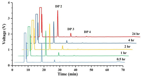 Thin-layer chromatography (TLC) analysis of soluble sugars released from chitosan (DDA > 94%) by Sn1-CSN indicated that chitobiose was predominantly produced at the stage of initial 30 min and accumulated as hydrolysis continued, and less chitotriose was also generated (Figure 10). No monomer glucosamine (GlcN, D) was observed even after 24 h, suggesting that it was an endo-acting enzyme. The HPLC results further confirmed the above results, with chitobiose (DP2), chitotriose (DP3), and chitotetraose (DP4) accounting for 87.3%, 11.3%, and 1.4%, respectively (hydrolysis time of 4 h) (Figure 11). The formation of chitobiose, chitotriose, and chitotetraose were also proved by MS (Figure 12).