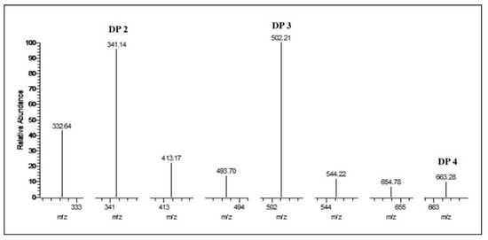 MS analysis of hydrolytic products of chitosan catalyzed by Sn1-CSN after 4 h.