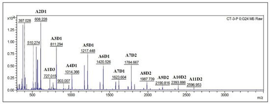 Since it has been found degree and position of acetylation of COS had important effects on biological activities of COS, partially acetylated chitooligosaccharides were also prepared from partially acetylated chitosan by Sn1-CSN. TLC results of partially acetylated chitosan (DDA 69%) were very similar to those of chitosan (DDA > 94%): chitobiose, chitotriose, and chitotetraose were detected, and chitobiose was still the main degradation product (Figure S3, Supplementary Materials), so were the HPLC results (Data not shown). However, MALDI-TOF MS analysis indicated that COSs with different DPs (DP 2–13) and different compositions of N-acetylglucosamine and glucosamine were clearly observed (Figure 13). Therefore, Sn1-CSN can be used to produce partially acetylated COS (paCOS).