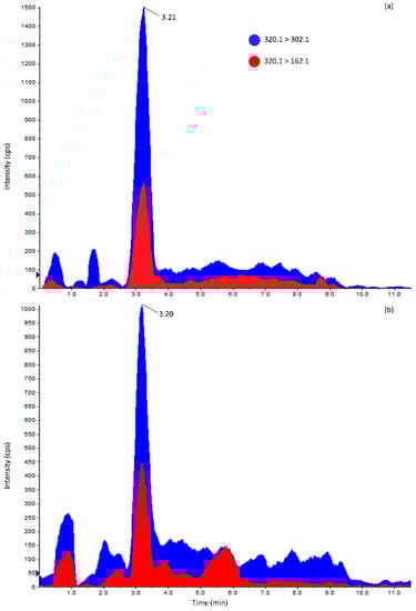 HILIC-MS/MS chromatograms of the (a) TTX matrix-matched standard (65 ng mL−1); (b) digestive gland of the field sample SN190702W (196 µg kg−1). 320.1 > 302.1, multiple reaction monitoring (MRM) transition for TTX quantification. 320.1 > 162.1, MRM transition for TTX confirmation.