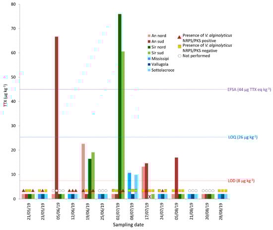 TTX concentrations and Vibrio alginolyticus in mussels collected from Pesaro and Ancona natural beds during 2019. X = not analyzed for TTXs.