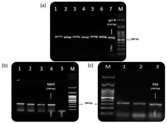 Agarose gel electrophoresis of PCR products of (a) gyr B (560 bp), (b) NRPS (300 bp), and (c) PKS (300 bp) genes in Vibrio alginolyticus strains isolated from mussels collected from the coast of the Marche region. Lane 1–6 in (a), 1–3 in (b), and 1–2 in (c) represent field samples; lane 7 in (a) represents the positive control of V. alginolyticus ATCC 33787(CTRL+). Lanes 4 in (b) and 3 in (c) represent the positive controls of V. parahaemolyticus ATCC 17802 (CTRL+); lane 5 in (b) represents the negative control (CTRL−). M = molecular weight marker.
