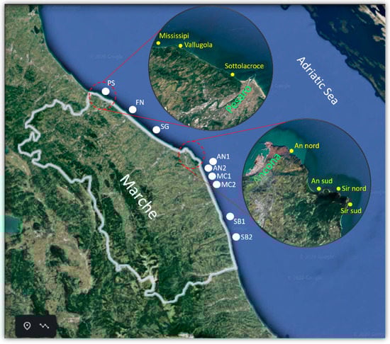 Mytilus galloprovincialis sampling sites along the Marche coast. Nine breeding sites: PS (PS), FN (Fano), SG (Senigallia), AN1 (Ancona 1), AN2 (Ancona 2), MC1 (Macerata 1), and MC2 (Macerata 2), SB1 (San Benedetto del Tronto 1), SB2 (San Benedetto del Tronto 2). Seven natural beds: Mississipi, Vallugola, Sottolacroce in the Pesaro area, An nord, An sud, Sir nord, and Sir sud in the Ancona area.