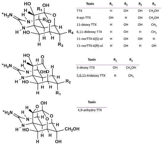 Tetrodotoxin (TTX) is the best known member of the group, but it co-exists with some other natural occurring congeners. There have been 30 structural analogues reported to date, with different degrees of toxicity depending on their chemical structure [,].