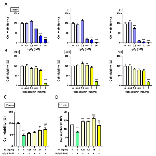Protective effect of fucoxanthin (Fx) on VIC cell viability following H2O2-induced oxidative stress. Rat heart valve interstitial cells (3000 cells/well) were cultured in DMEM/F12 supplemented with 10% FBS for 24 h. (A) Treated with H2O2 (0.1–10 mM) for 15 min, 1 h and 4 h. (B) Treated with Fx (0.01–5 mg/mL) for 24, 48, and 72 h. (C, D) Cells were pretreated with Fx (Fx, 0.01–1 mg/mL) for 24 h, then treated with 0.5 mM of H2O for 15 min. Cell viability was analyzed by MTT assay in (C) or through cell counting in (D). ***, p < 0.001 compared with untreated control cells. #, p < 0.05; ##, p < 0.01; ###, p < 0.001 compared with the H2O2-induced group. White bar, control group; Blue bar, different dosage of H2O2-induced group; Green bar, H2O2-induced group; Yellow bar, Fx-treated group.