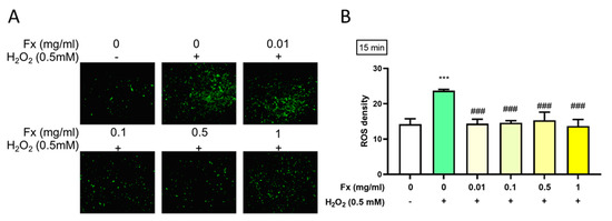 Effect of fucoxanthin (Fx) on the H2O2-induced ROS level. Rat heart valve interstitial cells were cultured in DMEM/F12 supplemented with 10% FBS for 24 h, pretreated with 0.01–1 mg/mL of Fx for 24 h, then treated with 0.5 mM of H2O2 for 15 min. ROS were visualized using DCFDA. These were assessed by microscopy at 200× magnification (A) and we used Image J for the density quantification (B). ***, p < 0.05 compared with untreated control group; ###, p < 0.001 compared with H2O2 group. White bar, control group; Green bar, H2O2-induced group; Yellow bar, Fx-treated group.