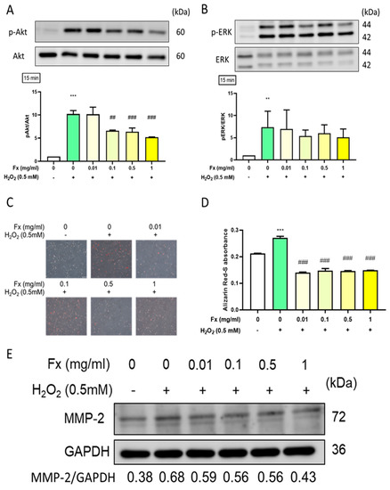Oxidative stress was shown to trigger calcification in VIC [18], which involves the activation of the Akt/ERK signaling pathway [19]. Therefore, we evaluated the effect of both H2O2 and Fx on the ROS and calcification-related Akt/ERK signaling pathway. The results showed that H2O2 treatment significantly increased the phosphorylation of Akt and ERK proteins. Notably, the pre-treatment with Fx was able to decrease such activation (Figure 4A,B). Furthermore, we used Alizarin Red-S for calcification staining and the results showed that calcification was increased in response to H2O2 and alleviated by Fx pretreatment (Figure 4C,D). Consistently, the Western blotting results showed that the Fx treatment was able to partially oppose the H2O2-induced ECM remodeling of marker matrix metalloproteinase 2 (MMP-2) in VIC cells (Figure 4E).