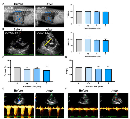 Long-term treatment with Fx in the 26 dogs resulted in a significant decrease in their vertebral heart size (VHS) (Figure 5A). VHS score is a number that normalizes heart size to body size using the mid-thoracic vertebrae as units of measurement, reflecting compensatory cardiac enlargement [20]. In addition, treatment showed the improvement of the left atrium to aortic (LA/AO) dimension ratio (Figure 5B), Tei index (Figure 5C), and E/e value (Figure 5D). The linkage of the mitral valve and tricuspid valve showed a significant decrease in echocardiography (Figure 5E,F). Collectively, Fx supplementation could improve the overall function of ventricular contraction and relaxation, confirming the findings of previous studies [21].