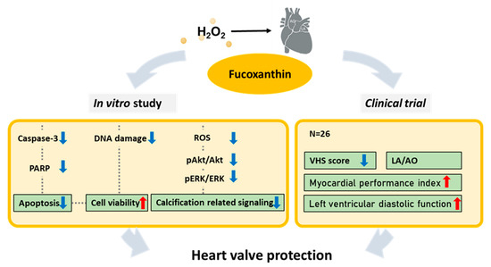 Cardiovascular diseases such as atherosclerosis and aortic valve sclerosis involve inflammatory reactions triggered by various stimuli, causing increased oxidative stress. This increased oxidative stress causes damage to the heart cells, with subsequent cell apoptosis or calcification. Currently, heart valve damage or heart valve diseases are treated by drugs or surgery. Natural antioxidant products are being investigated in related research, such as fucoxanthin (Fx), which is a marine carotenoid extracted from seaweed, with strong antioxidant, anti-inflammatory, and anti-tumor properties. This study aimed to explore the protective effect of Fx on heart valves under high oxidative stress, as well as the underlying mechanism of action. Rat heart valve interstitial cells under H2O2-induced oxidative stress were treated with Fx. Fx improved cell survival and reduced oxidative stress-induced DNA damage, which was assessed by cell viability analysis and staining with propidium iodide. Alizarin Red-S analysis indicated that Fx has a protective effect against calcification. Furthermore, Western blotting revealed that Fx abrogates oxidative stress-induced apoptosis via reducing the expression of apoptosis-related proteins as well as modulate Akt/ERK-related protein expression. Notably, in vivo experiments using 26 dogs treated with 60 mg/kg of Fx in combination with medical treatment for 0.5 to 2 years showed significant recovery in their echocardiographic parameters. Collectively, these in vitro and in vivo results highlight the potential of Fx to protect heart valve cells from high oxidative stress-induced damage.