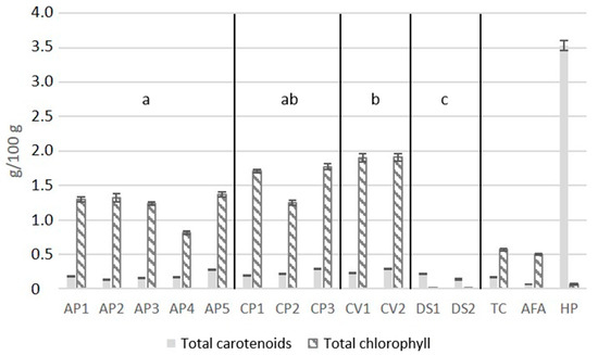 Concentrations of total carotenoids and total chlorophyll in fifteen microalgae in g/100 g d.w. a, b, and c denote significant (p < 0.05) differences in chlorophyll concentrations between species. There are no significant differences between the total carotenoid contents of the four species (n = 3; AFA, Aphanizomenon flos-aquae; AP, Arthrospira platensis; CP, Chlorella pyrenoidosa; CV, Chlorella vulgaris; DS, Dunaliella salina; HP, Haematococcus pluvialis; TC, Tetraselmis chuii).