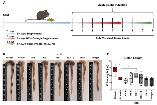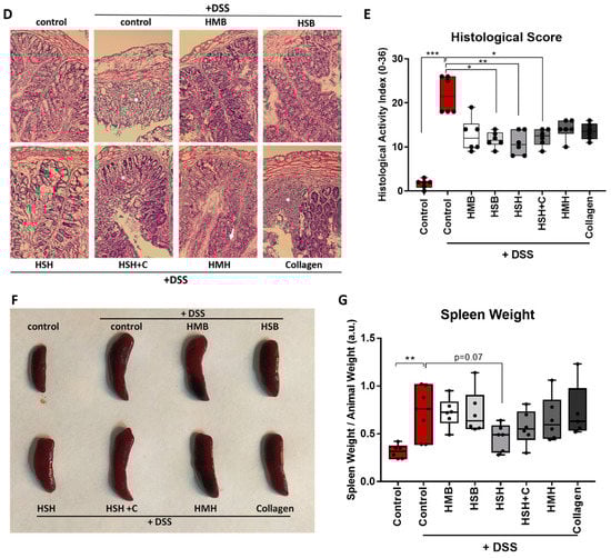 As expected, the colon of DSS-treated mice significantly contracted due to inflammation and tissue damage in comparison to the non-DSS control group (Figure 1B,C). Notably, the HSH nutritional supplement diet group exhibited significantly less colon contraction compared to the DSS control group, suggesting that the HSH supplement administration suppresses intestinal inflammation and tissue damage. In order to further support our data, histological evaluation of DSS-induced tissue damage was performed using hematoxylin and eosin staining (H&E) in colon tissue sections (Figure 1D). As expected, the DSS-treated control group exhibited extensive tissue damage, cell necrosis and loss of crypts (asterisk) compared to untreated mice. Notably, HMB, HSB and HSH diet groups exhibited reduced crypt loss, whereas HSH + C, HMH and Collagen groups displayed areas of broad inflammation triggering tissue damage (asterisks) as well as inflammatory cells infiltration (arrow) (Figure 1D). In order to further assess DSS-induced tissue damage, blinded histological scoring was performed according to Chassaing et al. [38] (Figure 1E). In accordance with the colon length measurements, HSH supplementation reduced DSS-induced tissue damage, and in addition HSB and HSH + C significantly improved colon histological features post DSS treatment (Figure 1E). Spleen is an organ with important hematopoietic and immune functions, and it is known to expand during inflammation due to proliferation of inflammatory cells, a phenomenon termed as splenomegaly [39]. The results show that there was a clear tendency of the HSH diet group towards limited spleen enlargement (p = 0.07), even though no statistical significance was reached (Figure 1F,G). This finding, combined with the previous observations, indicates that, among all compounds tested, the HSH dietary supplement exhibited the most potent result, which suggests a strong anti-inflammatory effect that partly suppresses DSS-induced colitis in mice.