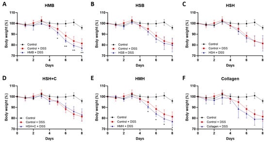 Body weight change of mice exhibiting DSS-induced colitis. (A–F). Total body weight was monitored daily and expressed as percentage of initial weight prior to experimental start in each diet group. Graphs represent median ± SD and 2-way ANOVA statistical analysis was performed. * p < 0.05, ** p < 0.01.
