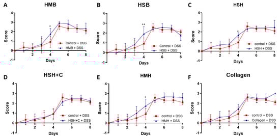 Throughout the experiment (5 days of DSS treatment and 3 days of recovery), colitis severity was measured daily based on a disease scoring system ranging from 0 to 3, as previously described [38]. During the first 5 days, no significant improvement was observed in any of the diet groups (Figure 3). In fact, four out of the six diet groups (HSB, HMH, HSH, and HMB) exhibited a higher disease score on day 4 compared to the DSS-control group. However, from day 6 to day 8, during which DSS treatment was terminated, no significant change in the recovery process was noted, and mice recovered from the worsening observed on day 4 in some groups (Figure 3). Nevertheless, mice recovered fast, suggesting that the supplements were not harmful to the intestine.