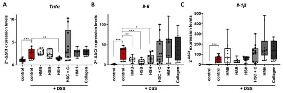Indeed, the expression of the aforementioned cytokines significantly increased in the intestines of DDS-treated mice compared to control (Figure 4A–C). Mice that received HSH as a nutritional supplement, which exhibited the least contracted colon and least expanded spleen (Figure 1), also expressed reduced Tnf-α mRNA, the hallmark cytokine of colitis and a therapeutic target, compared to the DSS-treated control group (Figure 4A). In addition, the same group exhibited reduced mRNA levels of Il-6 in colon tissue (Figure 4B), an observation also confirmed at the protein level in intestinal tissue homogenates and serum (Figure 5A,B). TNF-α protein levels in colon and serum were not detectable, possibly due to the short half-life of TNFα and the recovery period following termination of DSS administration, during which the healing process had initiated. Interestingly, when the HSH supplement was combined with collagen, the beneficial effect was not evident (Figure 4A,B). This may be attributed to the reduction in the net amount of HSH by half, which may not be enough to exhibit any anti-inflammatory action. Although the HMB and HSB diet groups did not affect colon length, thereby suggesting that they may not effectively suppress inflammation and tissue damage, significant reduction in Il-6 expression was observed (Figure 4B). The latter was also confirmed at the protein level in tissue homogenates and serum from mice that received the HSB nutritional supplement (Figure 5A,B). No differences in Il-1β expression were observed in any of the DSS-treated groups (Figure 4C).