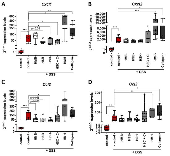 Chemokines are secreted factors that act as chemoattractants, inducing the migration of leukocytes from the blood stream to the site of inflammation. Intestinal inflammatory diseases, such as IBD, are characterized by the infiltration of neutrophils, monocytes and lymphocytes; therefore, chemokines have been proposed as critical modulators of intestinal inflammation [44]. Expression levels of two subfamily members of chemokines, CC and CXC, were measured in colon samples (Figure 6). CXCL1 chemokine, also known as KC, Groα and Gro1 oncogene, and CXCL2 chemokine, also termed as MIP-2, are members of the CXC chemokine subfamily and share approximately 90% similarity. They are expressed in macrophages, neutrophils and epithelial cells, are highly expressed in inflamed colon tissue and their main role is the recruitment of neutrophils to the infection site acting through the CXCR2 receptor [45]. CXCR2 knockout mice have been shown to present modest DSS-induced intestinal inflammation with reduced neutrophil recruitment and reduced kidney injury [46,47]. Interestingly, the HSH and HSH + C nutritional supplements as well as the HSB marginally downregulated the expression of Cxcl1 mRNA, potentially contributing to a reduced inflammatory response (Figure 6A). When CXCL1 protein levels were measured, the HSB group had indeed significant reduction in CXCL1, while the HSH group also presented a strong tendency towards reduced CXCL1 levels (Figure 6C). On the contrary, the HMH (which consumed more DSS-containing water) and collagen-administered groups exhibited elevated expression levels of both Cxcl1 and Cxcl2 chemokine mRNA, indicating a possible exacerbation of the inflammatory response through neutrophil recruitment (Figure 6A,B).
