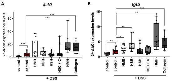 IL-10 is an anti-inflammatory cytokine and a major regulator of intestinal homeostasis, considering that the microbiota are in constant interaction with host immune systems, triggering immune activation [53]. In that context, IL-10 is necessary to establish an anti-inflammatory environment supporting microbial symbiosis. Intestinal inflammation disrupts this balance through the induction of pro-inflammatory cytokines and chemokines. In our study, acute intestinal inflammation was induced for five days through DSS administration and a subsequent three-day recovery period enabled us to examine the emergence of repair and tissue-healing mechanisms. Therefore, we measured Il-10 and Tgfb expression in tissue samples. TGFb is a key regulator of the intestinal immunity by inducing differentiation and activation of regulatory T cells (Tregs), promoting epithelial cell proliferation and supporting tissue repair [54]. Both the HMH and collagen dietary supplements significantly upregulated the expression of these anti-inflammatory mediators (Figure 7), possibly due to an increased leukocyte infiltration, also supported by the increased chemokine expression shown in Figure 6, and/or to compensate for a more excessive inflammation. In addition, tissues from the HSB and HMB diet groups exhibited increased expression of Tgfb (Figure 7B), further confirming their anti-inflammatory potential.