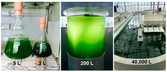 - Borowitzka, M.A.; Vonshak, A. Scaling up microalgal cultures to commercial scale. Eur. J. Phycol. 2017, 52, 407–418. [Google Scholar] [CrossRef]