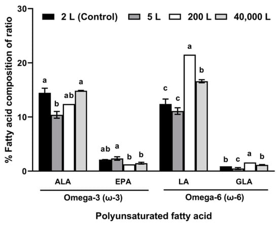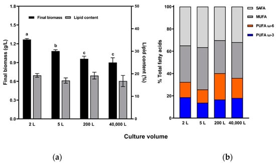 3.2. Production of Biomass, Lipids, and FAs under Four Different Culture Scales