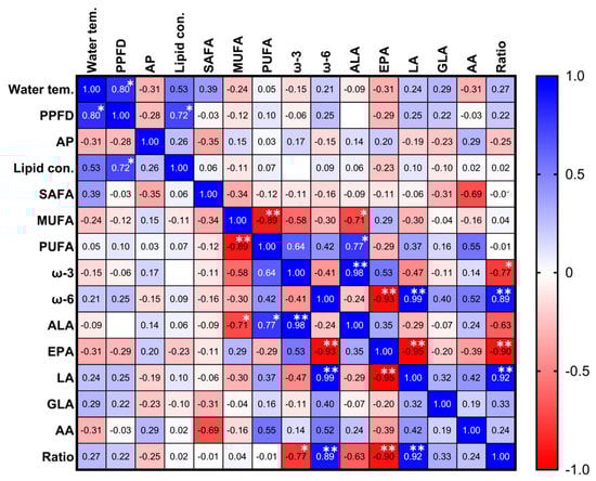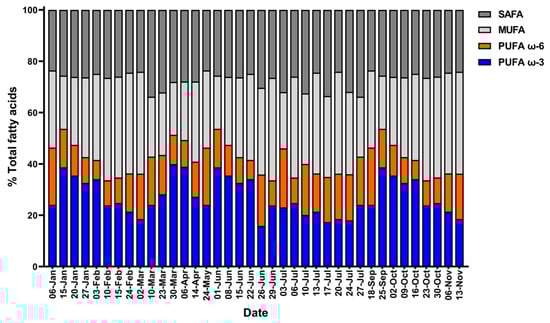 | Month | ALA (C18:3n3) | EPA (C20:5n3) | LA (C18:2n6) | GLA (C18:3n6) | AA (C20:4n6) | Ratio (ω-6/ω-3) |