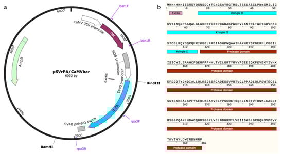Illustration of plasmid vector pSVrPA/CaMVbar used to transform T. subcordiformis (a) and representation of the rt-PA protein which contains His-tag (pink), Kringle II domain (blue-green), and Protease domain (brown) (b).