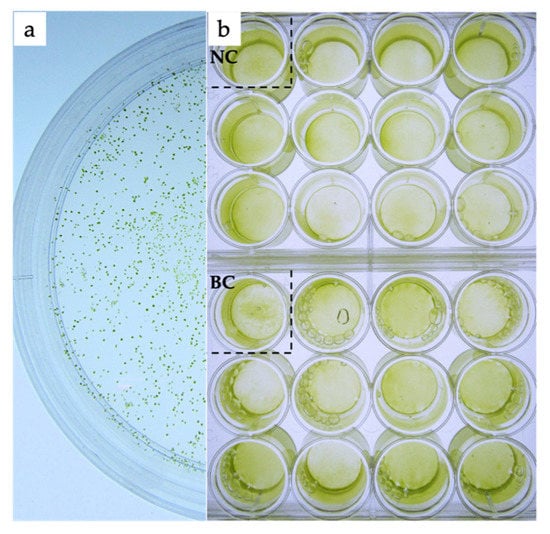 Herbicide PPT screening of transformed T. subcordiformis. (a) The PPT-resistance colonies appeared in solid modified f/2 medium containing 40 mg·L−1 of PPT; (b) culture of wildtype group, the negative control, and 22 PPT-resistance colonies without herbicide. BC, blank control, wildtype group; NC, negative control, a colony bombarded with gold powders without plasmid DNA.