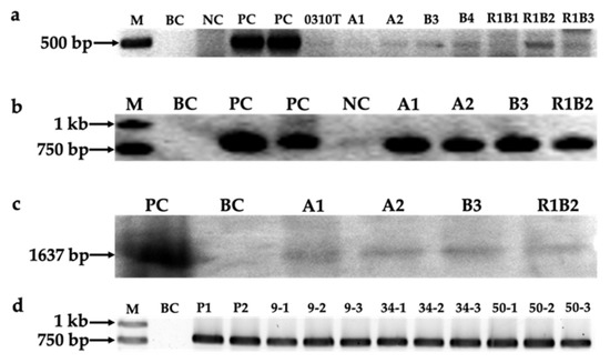 Results of PCR and Southern blotting detection for PPT resistance colonies. (a) PCR detection for bar gene; (b) PCR detection for rt-PA gene; (c) Southern blotting detection for colonies which had positive rt-PA gene signal in PCR detection; (d) PCR detection for rt-PA gene integration stability. M, marker; BC, blank control, the genomic DNA of wildtype algae strain; NC, negative control, the genomic DNA of algae strain bombarded with gold particles without plasmid DNA; PC, positive control, enzyme digestion product of plasmid vector pSVrPA/CaMVbar; P1, P2: B3 sample cultured with PPT; 9, 34, 50: B3 sample cultured without herbicide collected at day 9, 34 and 50.