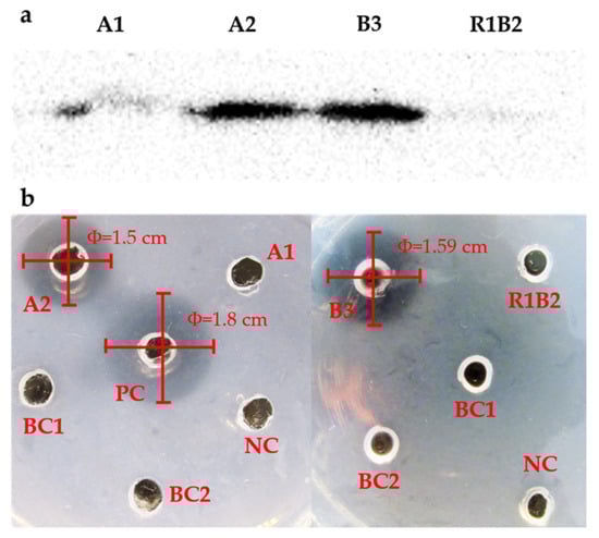 Results of Western blotting and FAPA detection for colonies A1, A2, B3, and R1B2. (a) Results of Western blotting detection; (b) FAPA experiment. BC1, blank control without any reagents in the well; BC2, blank control with PBS (used as protein solvent) in the well; NC, negative control with crude extract of soluble protein of T. subcordiformis in the well; PC, positive control with urokinase in the well.