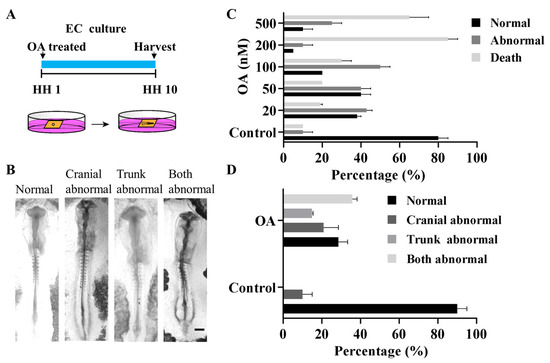 To explore the possible toxicological effects of OA on chick embryo development, EC culture was performed, as shown in Figure 1A. The HH10 chick embryos were exposed to the culture media containing different concentrations of OA (20, 50, 100, 200 and 500 nM). Three types of NTDs were observed, including cranial abnormality, trunk abnormality and both (Figure 1B), and some embryos died during the incubation. The mortality rate was the highest when embryos were exposed to OA at 200 nM or 500 nM, about 85% (Figure 1C), while the mortality rate was approximately 30% in the 20 nM or 50 nM OA treatment group (Figure 1C). When the embryo was exposed to OA at 100 nM, both cranial and trunk abnormality was about 40% (the highest) (Figure 1D). The embryos where the neural tubes were not closed on the cranial and trunk regions were selected as the research object.