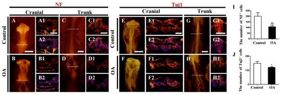 To investigate the effects of OA on early embryonic neurogenesis, we performed immunofluorescent staining with NF (neurofilament) and Tuj1 (class III β-tubulin) in OA-treated embryos (HH 10). As shown in Figure 3, the expressions of NF (Figure 3A–D2 and I) and Tuj1 (Figure 3E–H2 and J) were significantly reduced after exposure to OA. These indicate that OA exposure inhibit the neuronal differentiation, which might partially contribute to the OA-induced NTDs.